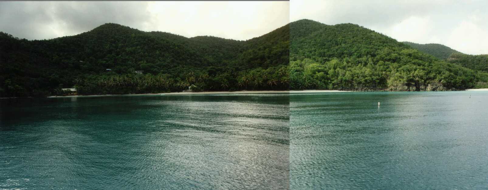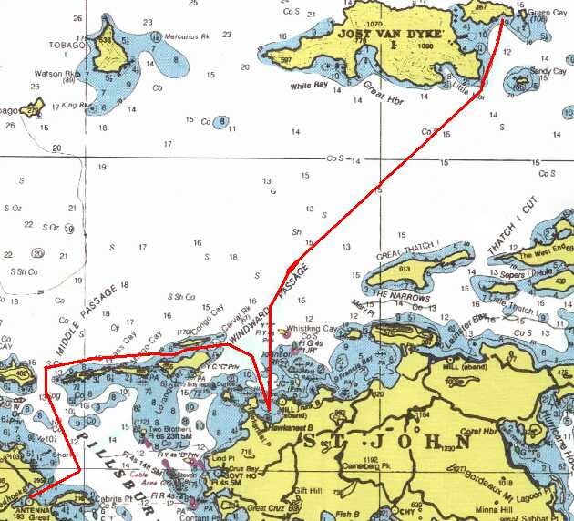 The following morning we had to prepare to return the boat. (Sigh ... the trip was half over). We sailed from LITTLE JOST VAN DYKE into the WINDWARD PASSAGE and moored for a couple of hours on ST. JOHN in HAWKSNEST BAY. Had the beach and rocks to ourselves for some swimming and snorkeling. Sailed west across the WINDWARD PASSAGE between CONGO CAY and LOVANGO CAY. Passed MINGO CAY and GRASS CAY then tacked into the MIDDLE PASSAGE and back into PILLSBURY SOUND for our return to RED HOOK BAY.